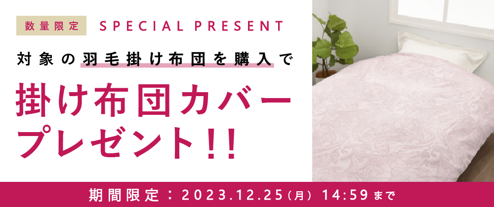 - 対象期間内で1会計につき対象の羽毛布団を1点以上、ご購入の方に掛けカバー1点をプレゼント