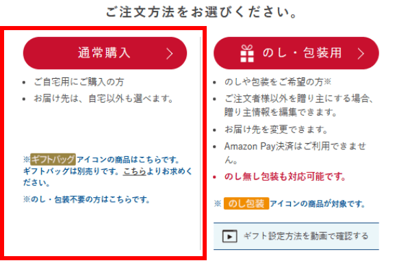 カート画面で上記のように購入方法の選択が表示された場合は、「通常購入」を選んでお手続きを進めてください。