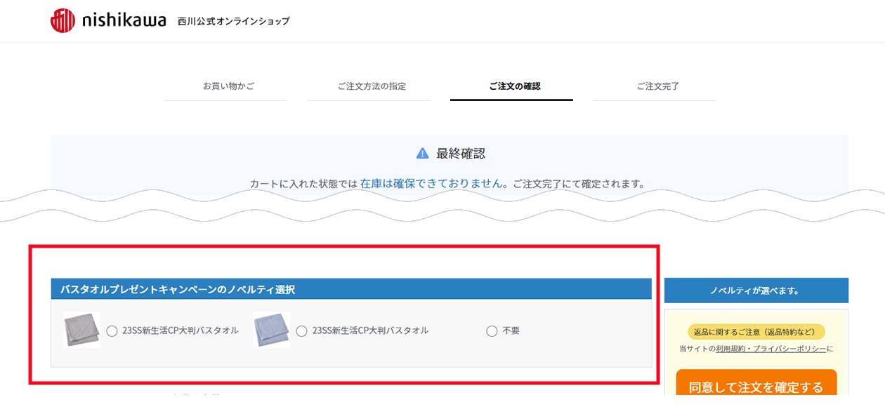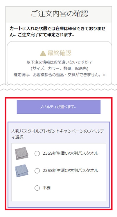 受け取り方法 - ご注文の確認画面で「ノベルティ選択」が表示されます。