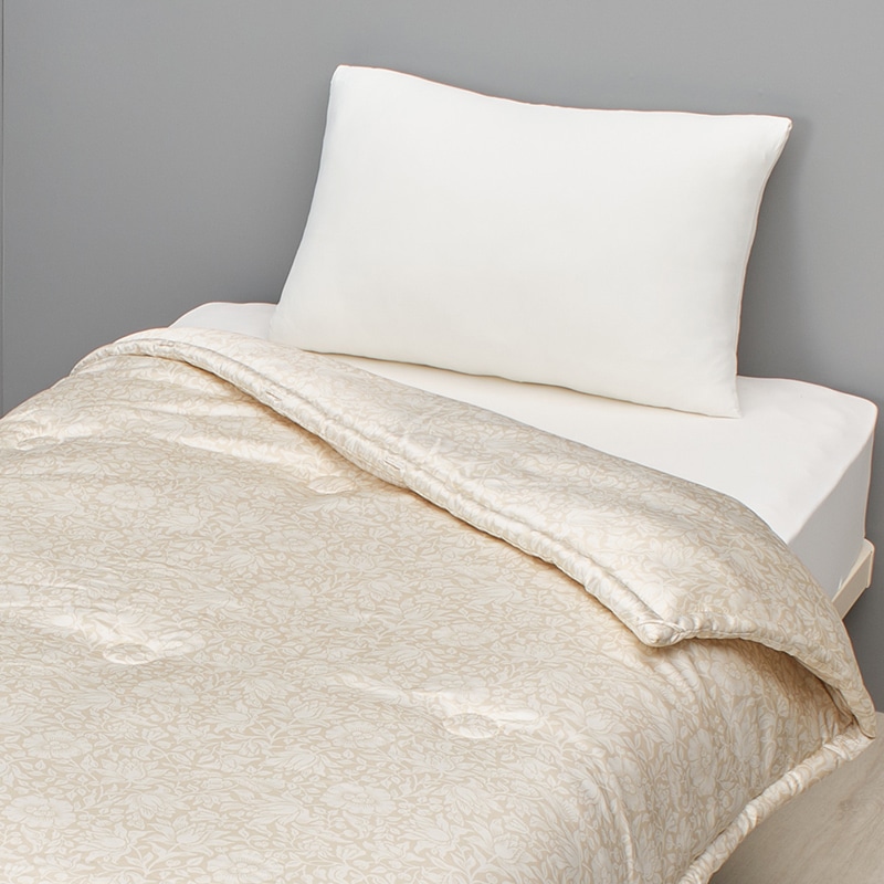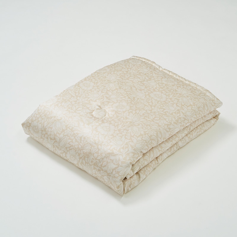 モリスならではの美しい草花紋様をプリントしたシルクサテン生地で、手挽回数450回の近江真綿を優しく包み込んだ逸品です。