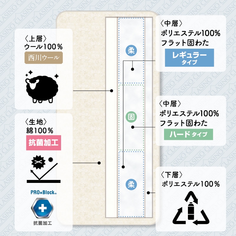CLASINO(クラシノ)は、お客様のお声を元に「寝心地」だけでなく、「取り扱いやすさ」や「清潔さ」といった敷きふとんに関する様々なお問い合わせを見つめ直し、暮らしの中で求められる機能をカタチにした敷き寝具のシリーズです。【上層 西川ウール(R)使用】