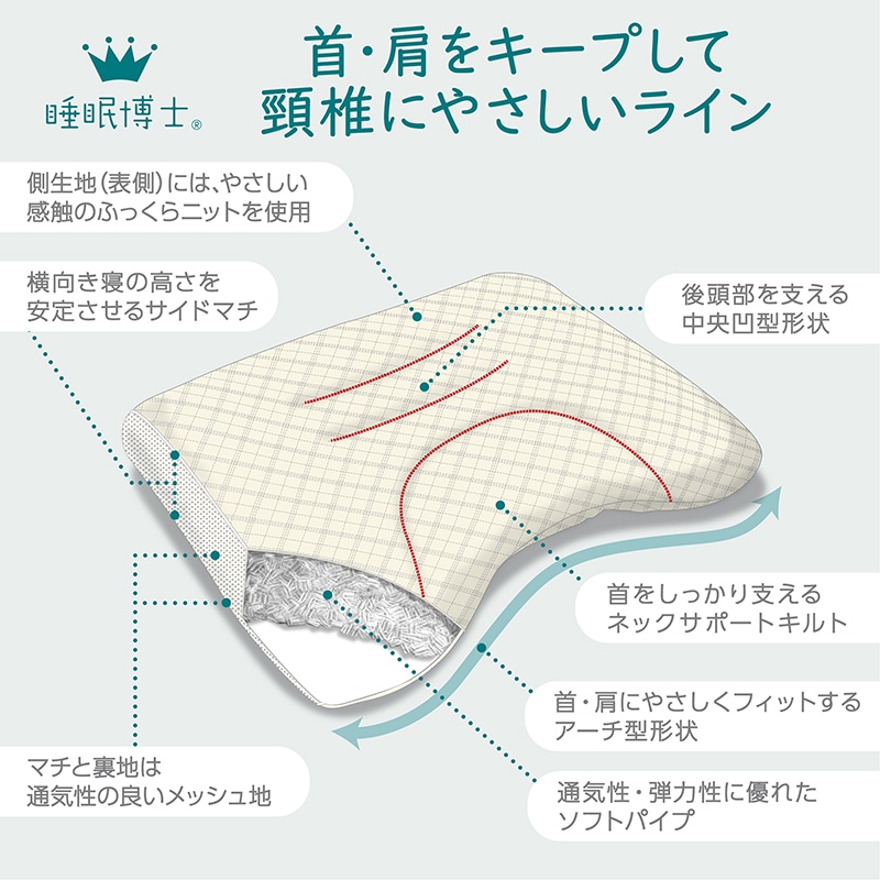 後頭部のおさまりの良い中央凹型構造で、首と肩にやさしくフィット。