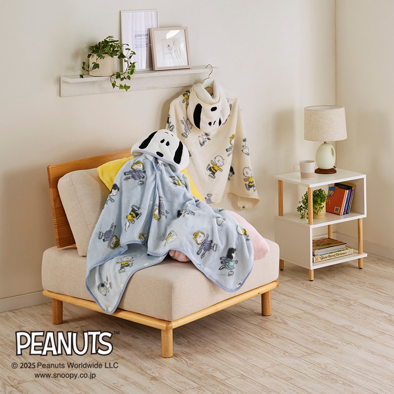 スヌーピーと仲間たちがスケートを楽しむかわいいデザインのブランケット。