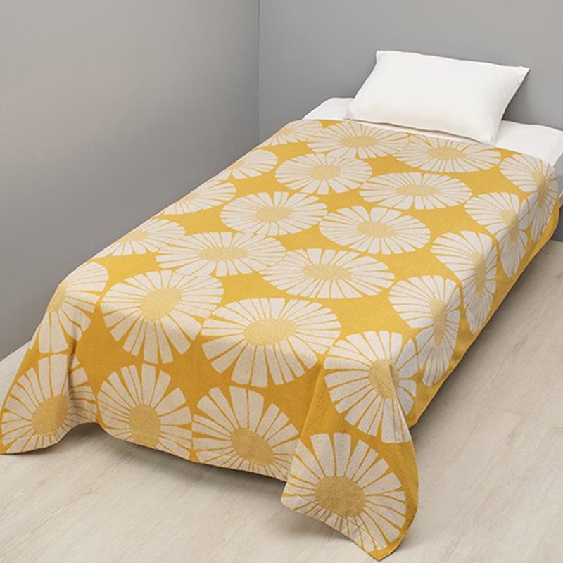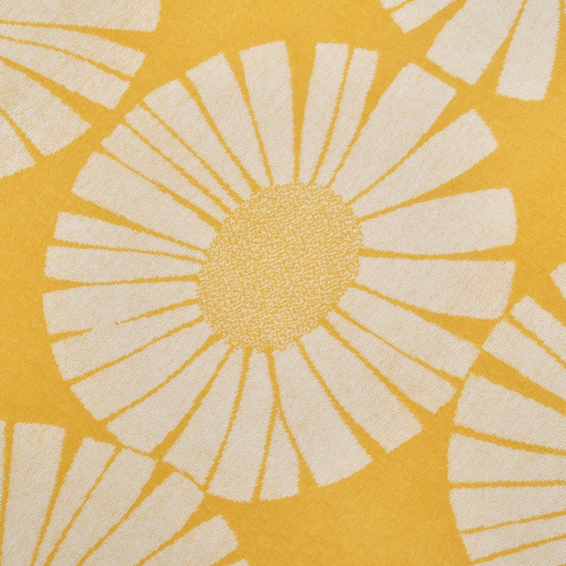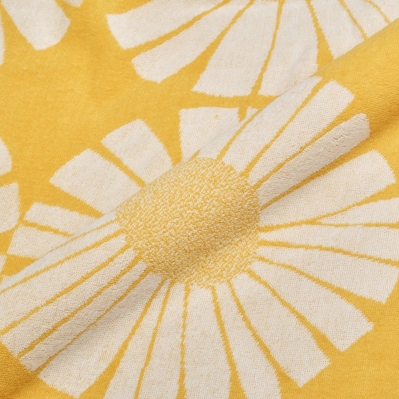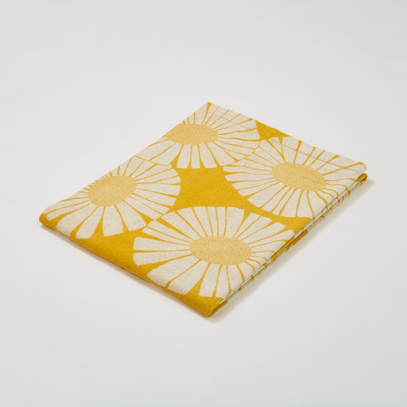 レトロな魅力あふれる柄「VALO(ヴァロ)」。夏の太陽の下で白い花びらを大きく広げたデイジーが描かれています。【ジャカード織のタオルケット】
