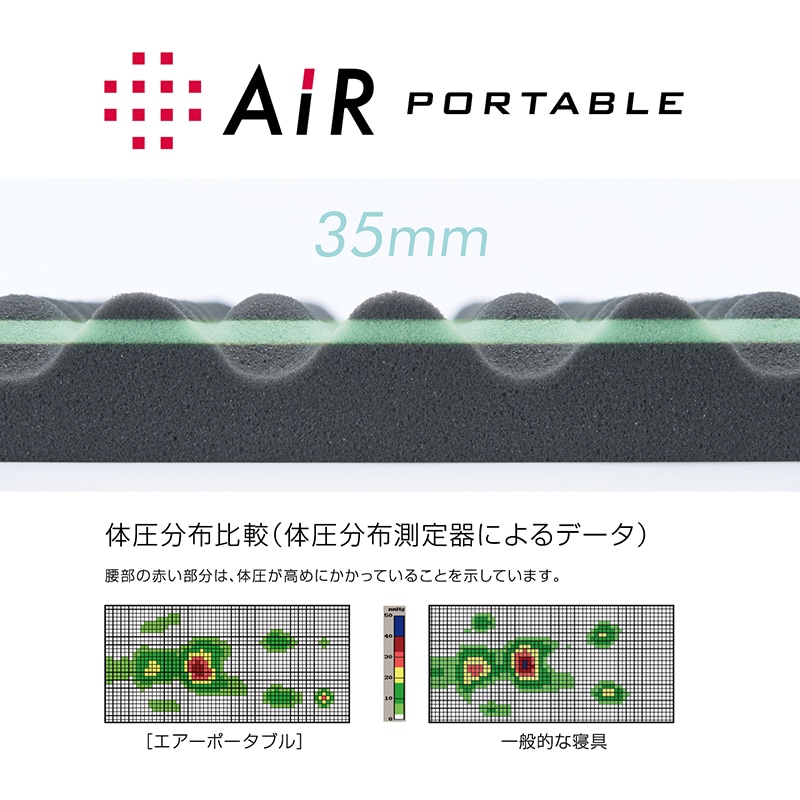 [エアーポータブル]モバイルマットいつでもどこでも、快適な睡眠をお届けしたい。モバイル性を追求して生まれたのが、[エアーポータブル]。この一枚をプラスするだけで、[エアー]の機能を発揮、快眠をサポートします。
