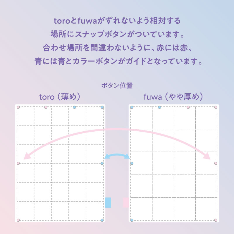 toroとfuwaがずれないよう相対する場所にスナップボタンがついています。