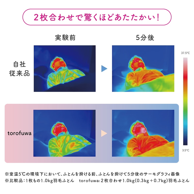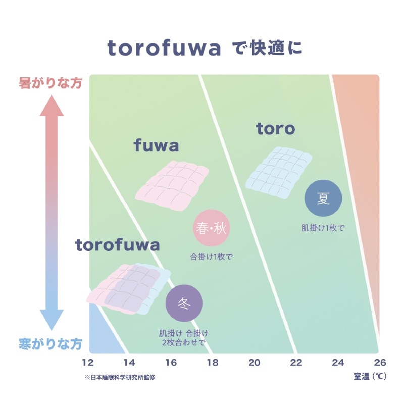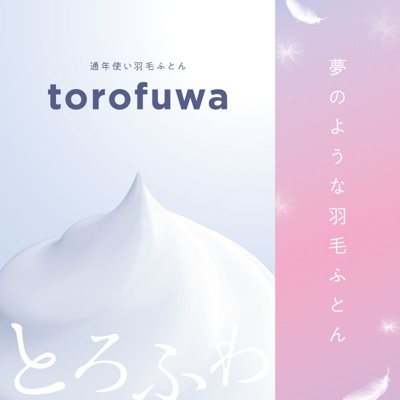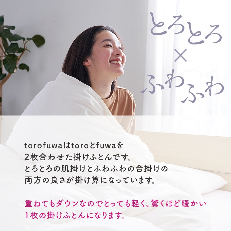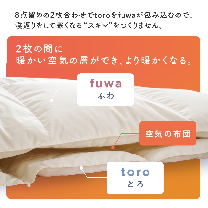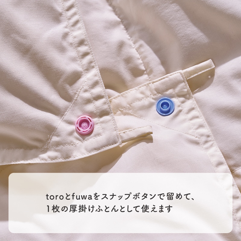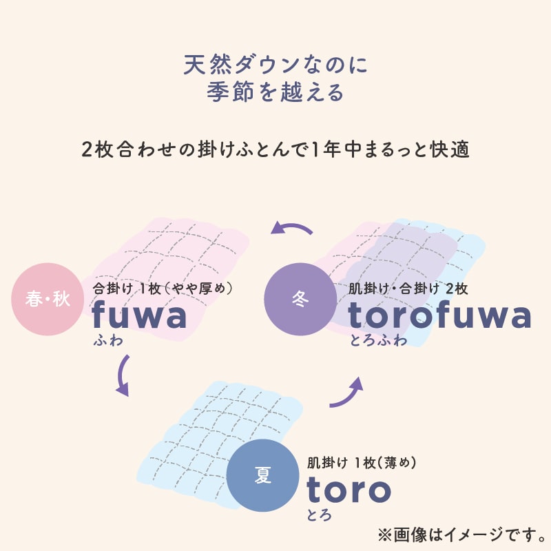 toro(トロ 羽毛肌掛けふとん)とfuwa(フワ 羽毛合掛けふとん)の2枚の羽毛ふとんを自由に組み合わせて、年中快適にお使いいただけます。