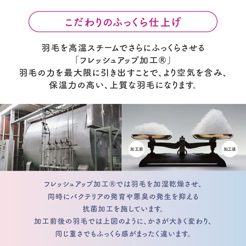 羽毛を徹底的に洗浄し、nishikawa(西川)独自の「フレッシュアップ加工(R)」を施したダウンは