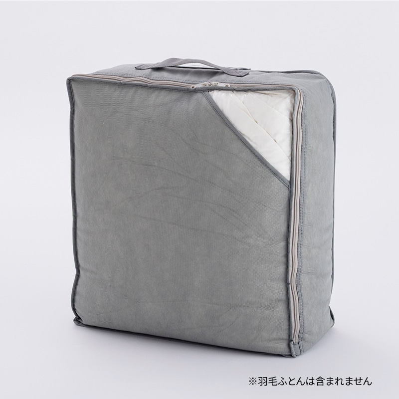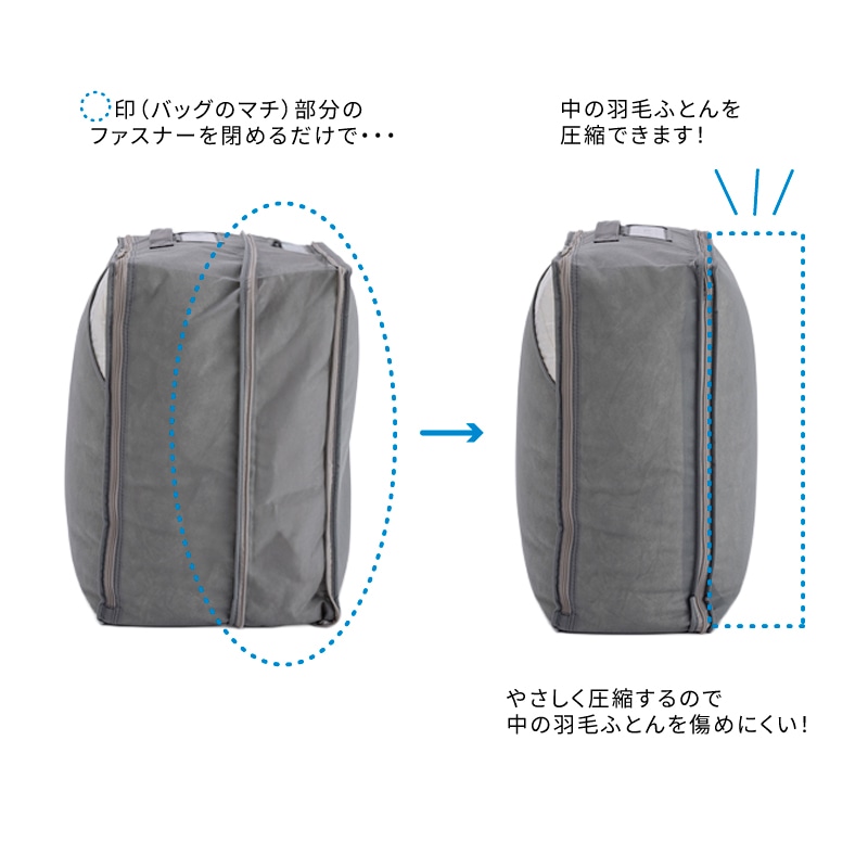 羽毛ふとんをバッグに入れて、マチ部分のファスナーでコンパクトに収納できる便利なバッグ。