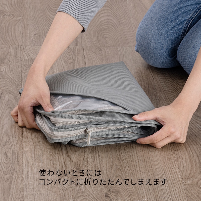 従来の圧縮袋のように掃除機を使用する手間がなく、中の羽毛を傷めずに、省スペースで保管できます。