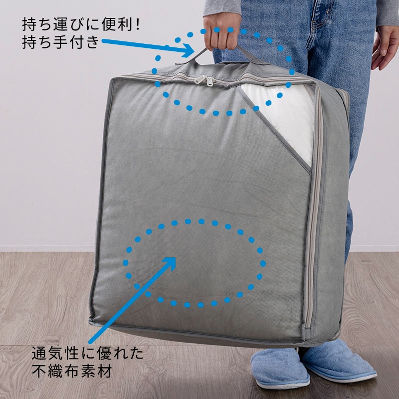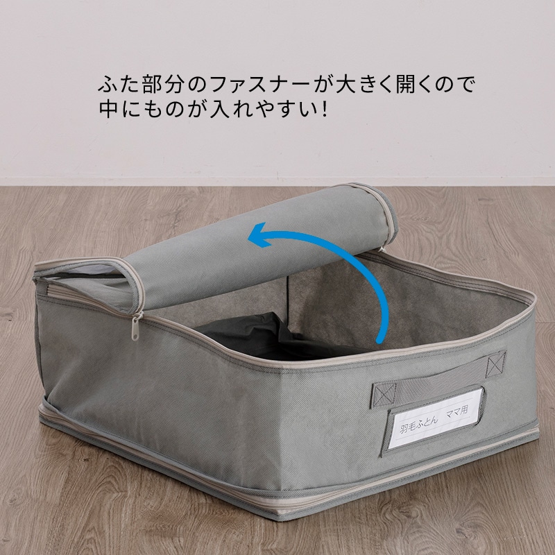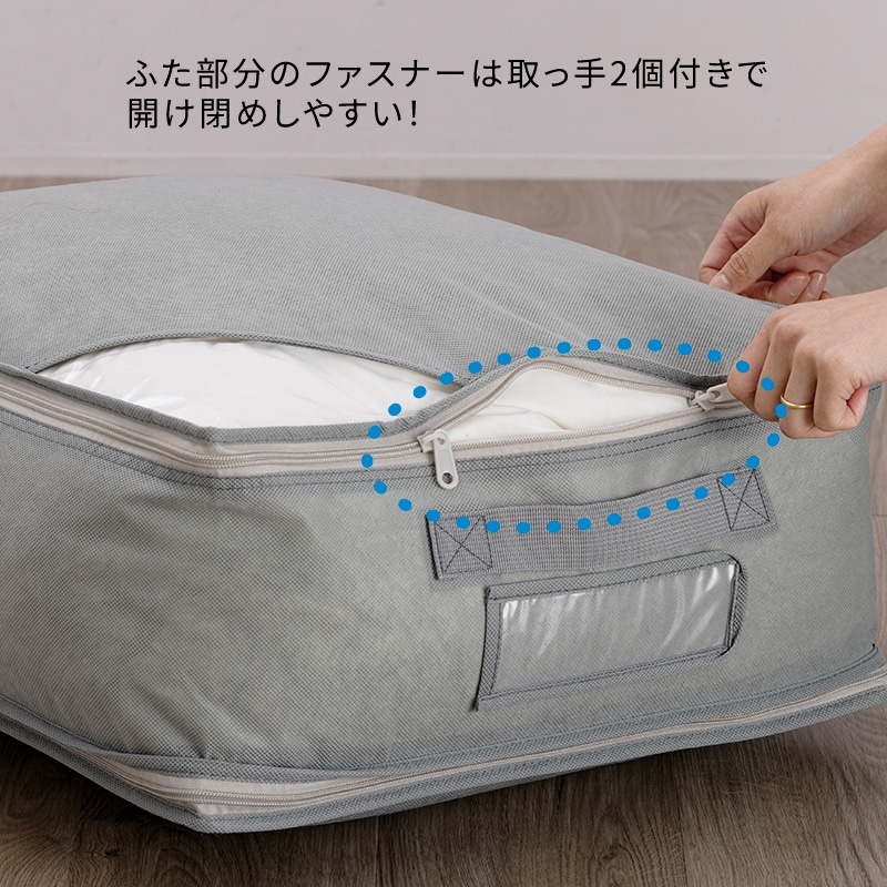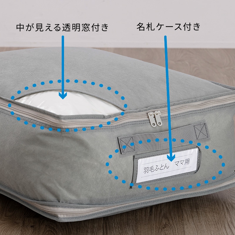 通気性に優れた不織布素材を使用しています。 羽毛ふとん以外の寝具、衣服を収納するのにも便利です。【中が見える透明窓付き&名札ケース付き】