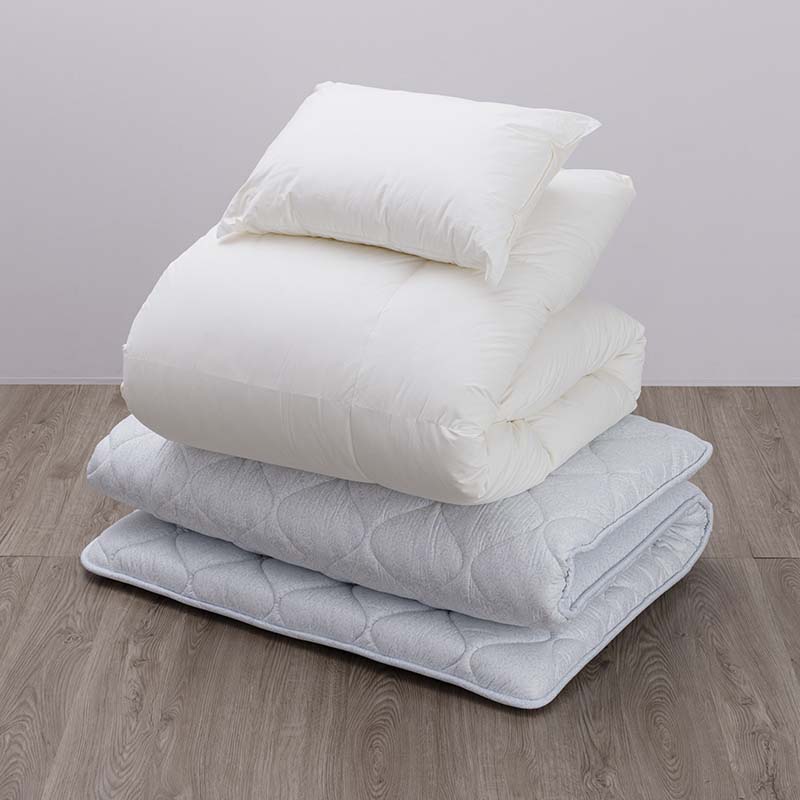 羽毛掛け布団、敷き布団、枕の3点セット。