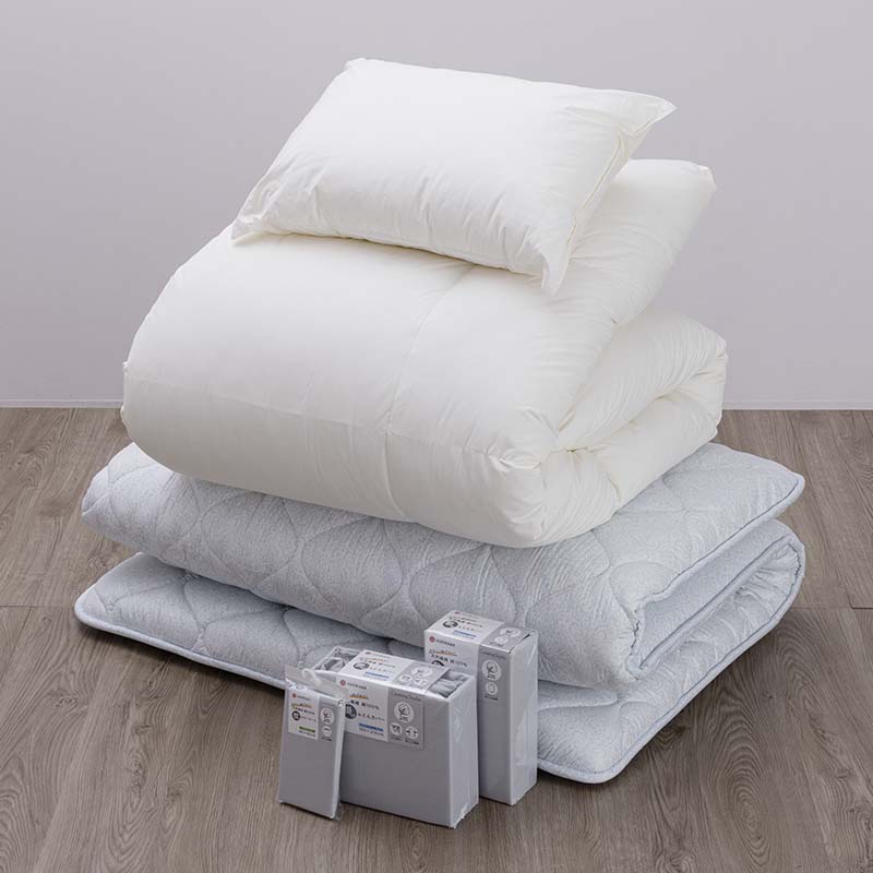 羽毛掛け布団、敷き布団、枕、掛け布団カバー、敷き布団カバー、枕カバーの6点セット。