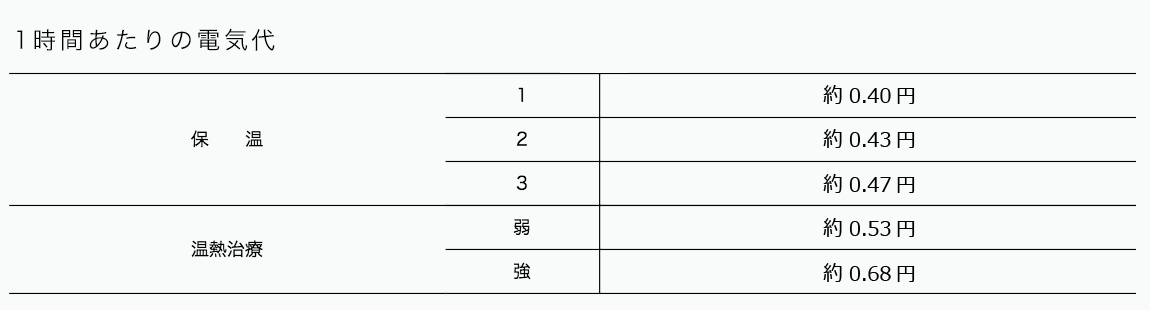 - 1時間当たり温熱治療ご使用の場合「強」で約0.62円、「弱」で約0.48円です(JNR-1003 SG1の場合)。尚、電位治療のみご使用の場合、電気代はほとんどかかりません。