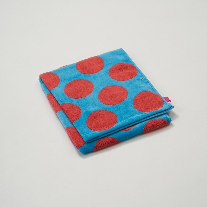 タオルから飛び出したカエルと、アツコマタノのデザインで根強い人気の大胆な水玉デザイン。