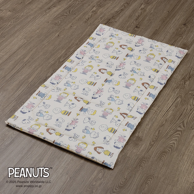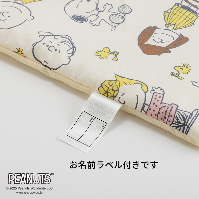 スヌーピーとなかまたちが描かれた、カバーを付けずにそのままお使いいただけるお昼寝用敷きふとんです。手間がかからず便利にお使いいただけます。