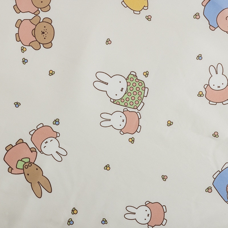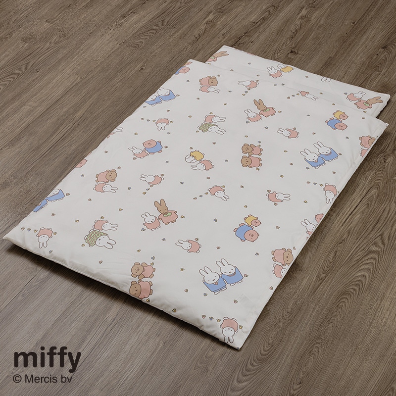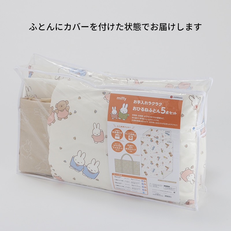 ミッフィーと仲間たちのデザインのお昼寝布団5点セットです。掛けふとんカバー、掛けふとん、敷きふとんカバー、敷きふとん、バッグの5点すべてご家庭でお洗濯OK。