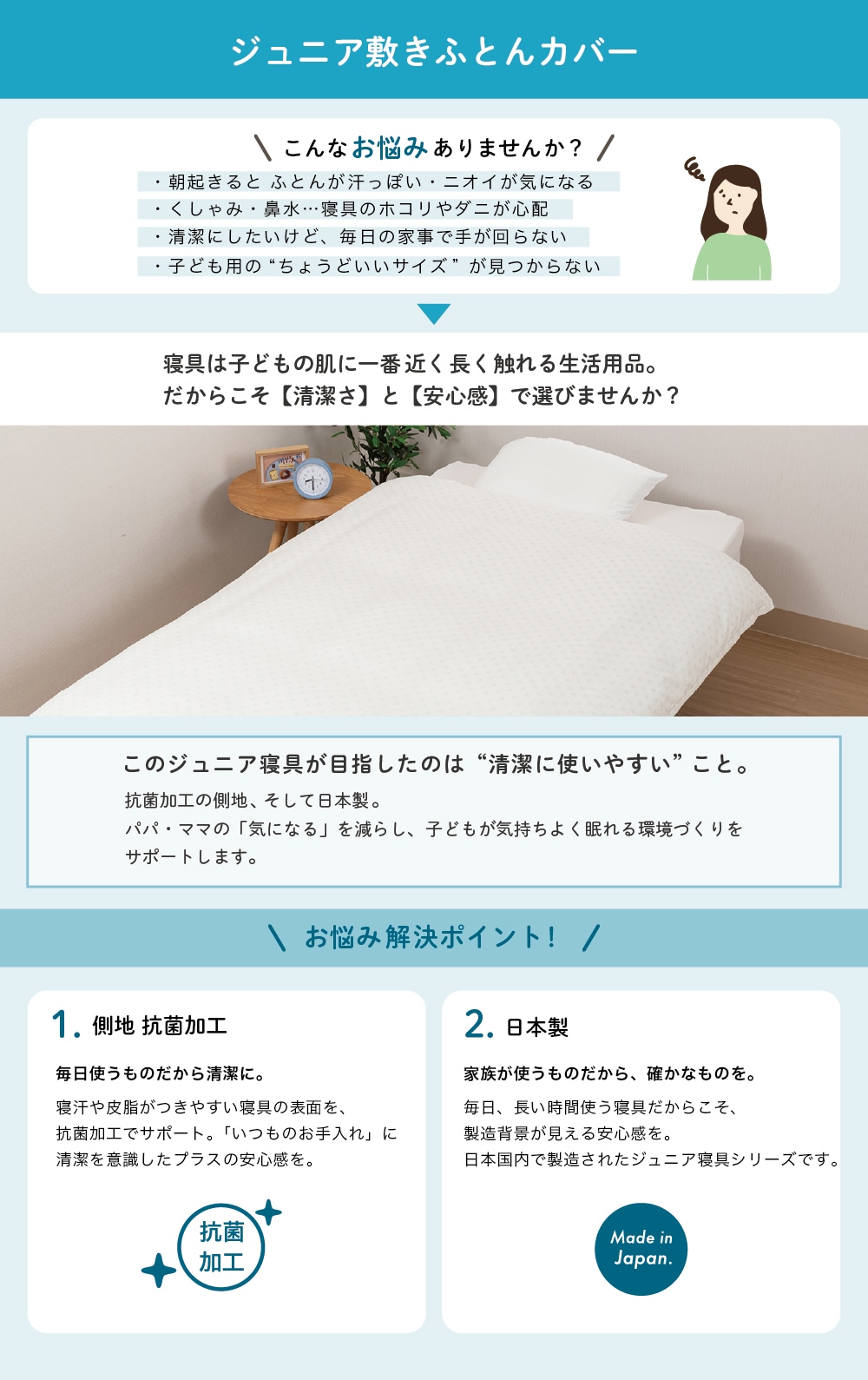 綿100%生地に抗菌加工を施した敷きふとんカバー。