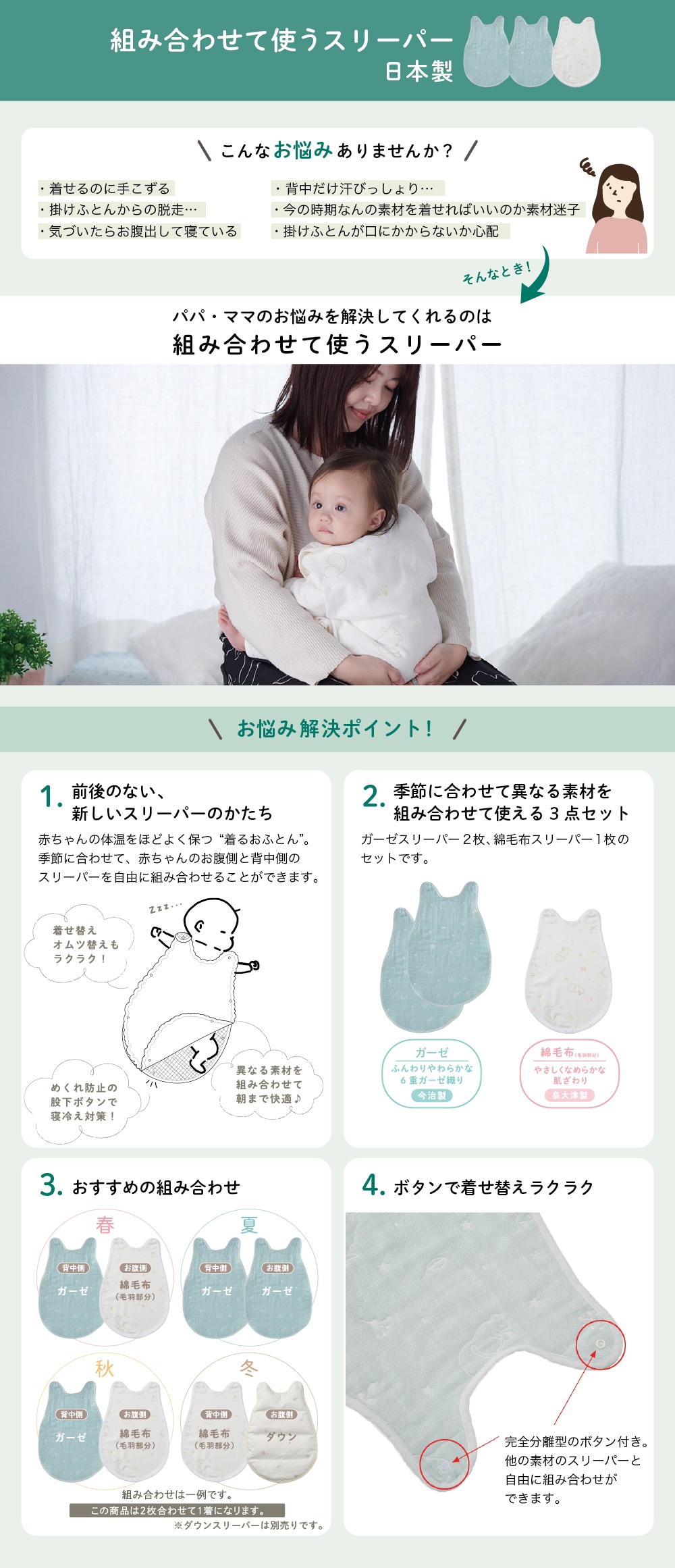 季節や時期に合わせた最適な組み合わせを自由に選べます。【大切な赤ちゃんのためのスリーパー(3枚セット)】