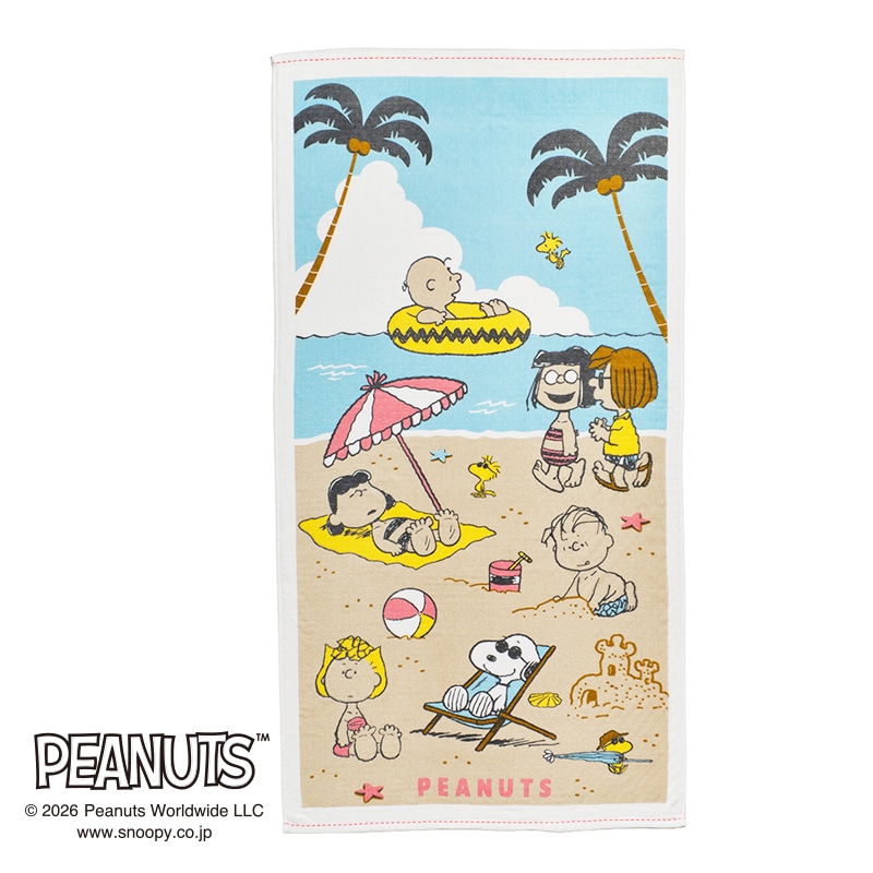 スヌーピーと仲間たちがビーチで楽しむ様子を描いた、夏らしいデザインです。【紙の帯巻きラベル付き】