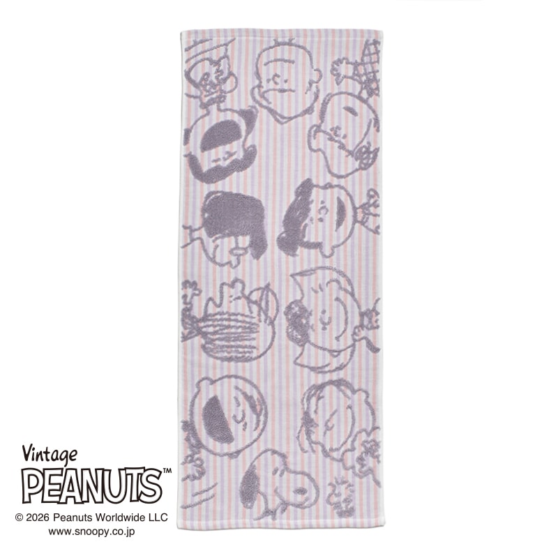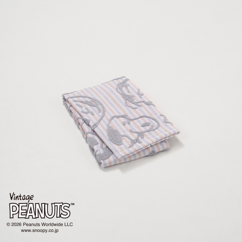 ガーゼ地に無撚糸パイルでスヌーピーと仲間たちが浮き出るデザイン。