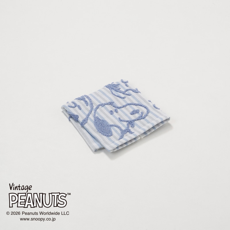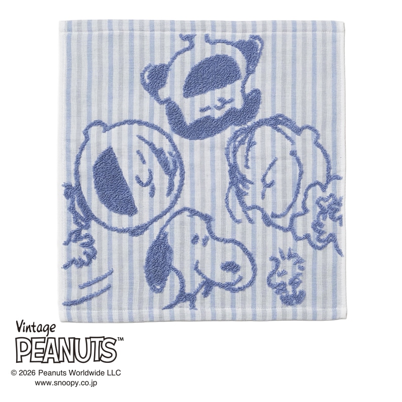 ガーゼ地に無撚糸パイルでスヌーピーと仲間たちが浮き出るデザイン。