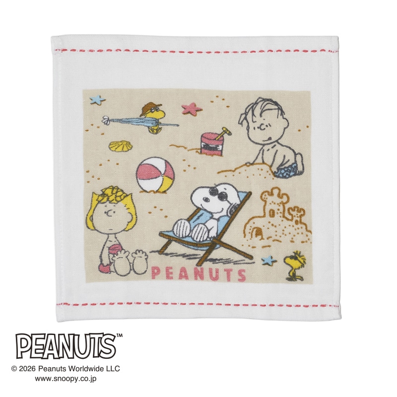 スヌーピーと仲間たちがビーチで楽しむ様子を描いた、夏らしいデザインです。【紙の帯巻きラベル付き】