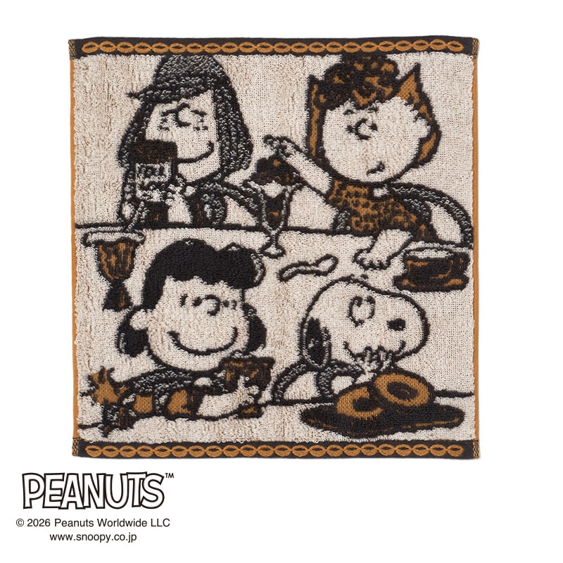 スヌーピー、ルーシー、サリー、ペパーミント パティがおやつを食べているデザインをジャカード織で表現。
