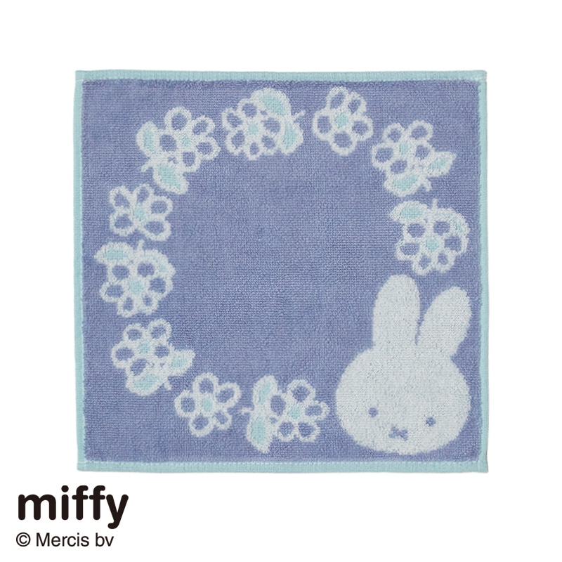 ジャカード織で表現したミッフィーとリースのようなお花がかわいいミニタオルです。